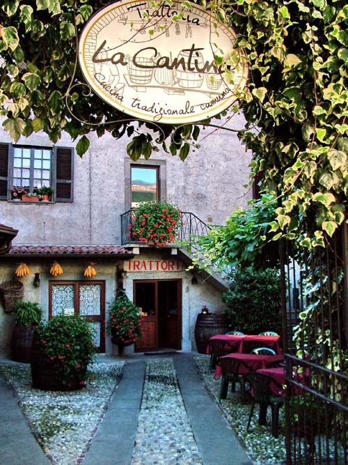 Chi conosce da tempo questo luogo collocato al centro dell’abitato di Esine, può trovare superfluo l’aggiunta di uno di quei termini alla lista dei prodotti, con relativi produttori, presente su ogni tavolo del locale. Dalla sua apertura La Cantina ha utilizzato, in maniera prevalente, materie prime dei dintorni – come non ricordare i fagioli “copafam” e i “miglioncini”… – elaborate con sicurezza crescente da Oriana Belotti e presentate con semplicità da Giacomo Bontempi. Due sale interne, più lo spazio del cortile durante la bella stagione, magari seduti al lungo tavolo sotto il pergolato di vite. Trattoria con poche o nulle concessioni alle “mode” e con l’ambizione di voler offrire quanto di buono e autentico si possa reperire oggi in Valcamonica. Perciò nulla di retorico o studiato, nell’elenco in dialetto camuno che fa mostra di sé all’ingresso dell’edificio che ospita La Cantina, dal quale ogni giorno vengono proposti, a rotazione e secondo stagionalità, una decina di piatti. Ricette come ”L’ors al hai ursino”, l’orzotto all’aglio orsino di convincente delicatezza, o “La minestra dè hcandela”, sempre orzo ma in saporita minestra, i “Taedei de Castegna” pasta fresca con farina di castagna condita con burro e salvia, “Al formagel parat” che accanto al formaggio sciolto in padella può vedere l’uovo, il tartufo locale, la cipolla … o il morbidissimo “Al cavriol arost”, capriolo arrosto profumato di burro, rappresentano un patrimonio di conoscenza e cultura che mai vorremmo andasse perso. Posso continuare citando la torta di lumache, la frittura di capretto, gli gnocchi agli spinaci selvatici, la salsiccia di castrato, il manzo all’olio e le sardine alla griglia, uniche concessioni, con il baccalà e la trota in carpione servita negli antipasti, a una tradizione ittica “povera”.