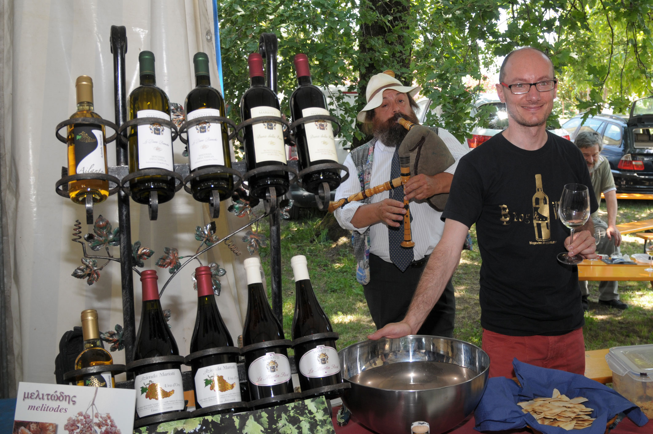 Il caldo si fa sempre più presente … Christian fra poco si rifugerà sotto l’ombra di un albero, ma prima gli ultimi scatti: come abbandonare il raduno dei Sovversivi senza fermarsi dinanzi al “Frizzo della Franciacorta”? Ad accoglierci i sorrisi di Lucia Barzanò, il Mosnel, e Giovanni Arcari cicerone dei suoi pupilli Colline della Stella e Camossi. Prima un consiglio, chiedo a Lucia qualcosa da abbinare alla gustosa carne “accomodata” nelle barchette che ha sostituito il risotto e lei, ancora un sorriso, mi propone il suo Parosè – 2004 se ben ricordo -, il vino ben rappresenta ciò che amo di questa tipologia: profumi eleganti, compostezza, freschezza, e “regge” con disinvoltura l’abbinamento mantenendosi lontano da eccessive morbidezze e frutti sfacciati tesi alla ricerca del maggior numero di estimatori … Più tardi, nonostante le conosca bene e complici i coniugi Dhò, Giovanni ci parla, e ci fa assaggiare, le bottiglie di Andrea Arici e dei fratelli Camossi. Averli conosciuti personalmente, aver parlato a lungo del progetto TerraUomoCielo, presente anche il bravo Nico Danesi, mi fa apprezzare in modo “diverso” questi Franciacorta, frutto di passione e impegno: mi piacerebbe poter dedicare un poco di tempo alla degustazione dei nuovi millesimati proposti da entrambe le aziende …
