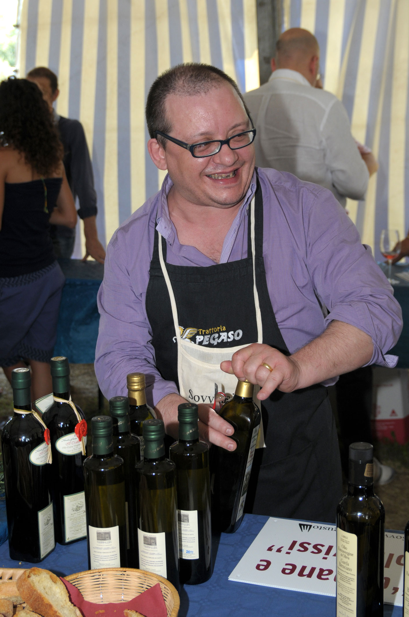 La giornata volge al termine, mi ferma la bella presenza di Rosetta figlia di Giona Hauner, mi fermano le poche migliaia di bottiglie fatte con qualcosa che si avvicina più al cuore, all’anima che alla mente: nella loro Malvasia delle Lipari, e nell’annata bevuta, niente opulenze ed eccessi zuccherini a stancare pressoché immediatamente la bocca. Grazie per quello che comunicate … Mi guardo attorno: visi “tirati” ma contenti, appagati, uno per tutti? Quello di Enrico Di Martino, Cascina Belmonte, effetto anche, pensiamo, della vicinanza con Alberta Follador … I banchi iniziano a svuotarsi, in alcuni la curiosità e la golosità dei visitatori ha fatto deserto, un’ultima sosta a salutare e conoscere Fiorella Missoni, la Nicchia dei Sapori a Milano con le sue selezioni di deliziosi formaggi. Un grazie a tutti voi, la vostra presenza, il vostro entusiasmo, i vostri prodotti dicono che c’è ancora speranza, che ha senso impegnarsi lungo queste non facili strade, in risposta a un’omologazione e a un appiattimento che “morbidamente”, s’insinua non solo nei nostri consumi ma anche nelle nostre abitudini. Questi prodotti hanno preciso senso perché dietro di loro ci sono volti: uomini, donne, a rispondere direttamente delle loro scelte. Un grazie all’azienda dei Fratelli Trevisani che ha ospitato il tutto nello splendido scenario della loro azienda collocata sulla collina Galuzzo nella sponda occidentale del lago di Garda, un grazie ad Adriano Liloni, che infaticabilmente ha macinato chilometri, non è modo di dire, per i suoi Sovversivi …