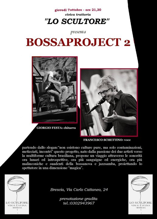 Queste le parole utilizzare da Giorgio Festa e Francesco Schettino, in rigoroso ordine alfabetico, per descrivere BOSSAPROJECT2 il loro progetto che rimanda al Brasile degli anni ’50 e alle sue traversie storico politiche ma anche, e soprattutto, alla sua musica: “O Samba”, il Samba su cui s’innestano nervature Jazz. Non a caso Francesco è presidente dell’Associazione culturale bresciana Jazz on the road il cui riuscitissimo Festival 2010 ha già trovato spazio in queste pagine, forse non a caso il titolo mi richiama alla mente il Bossa Nova Project di Franco Cerri, grande, longevo e attivissimo chitarrista Jazz italiano. Contaminazioni e incontri, come si legge sopra, temi cari a MadeinBrescia convinti come siamo che è solo dall’incontro, tra persone principalmente, che è possibile perpetuare e condividere le proprie tradizioni, la propria identità; se poi aggiungiamo che il tutto sarà legato