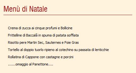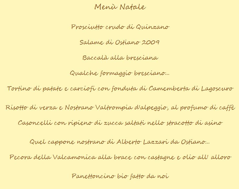 Lo confesso, questo periodo è per me un poco travagliato, complici alcune situazioni non particolarmente esaltanti e qualche ricordo della mia disavventura d’inizio ottobre … Rassicuratevi comunque che non vi tedierò con l’elenco dei miei malanni o delle mie preoccupazioni anzi, vorrei utilizzare questo post per farvi gli auguri, miei e di MadeinBrescia, e rendervi partecipi di una mia veloce incursione tra i menu natalizi proposti da alcuni ristoranti bresciani. Di tre riporto l’intera composizione, di altri alcune proposte per scrivere con il vostro aiuto, qui sta la parte più interessante, una sorta di “compendio” del pranzo di Natale nella nostra provincia. Siete di conseguenza tutti invitati a riportare di seguito commenti, ricette, ricordi, menu interi o a inserirli nella sezione “Discussioni” sulla nostra pagina facebook.