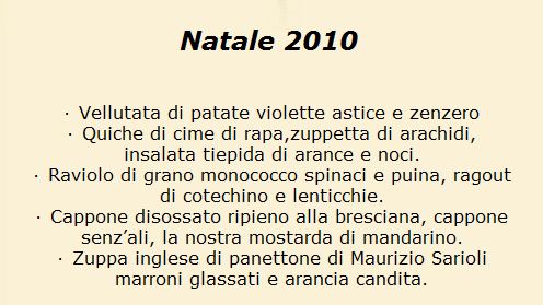 Prima che qualcuno lo pensi, tengo a ribadire che quello sopra riportato è un brevissimo excursus delle proposte di alcuni ristoranti e trattorie bresciane per il pranzo di Natale e non vuole certamente essere graduatoria o tantomeno unica lista possibile, vero è che non appaiono locali dove non mi sognerei di andare … A proposito di Cappone aggiungo tra i piatti citati quello di Stefano Cerveni nel suo menu dedicato: “Cappone allo Spiedo, Castagne e Tartufo Nero” – Due Colombe Ristorante al Borgo Antico e per i primi, complice mia nonna che sia pure di Leno -questa pasta ripiena sa di Romagnolo e Marchigiano, non certo di Bresciano – li faceva, i “Cappelletti di Pasta Fresca al San Daniele nel Brodo di Cappone” …
