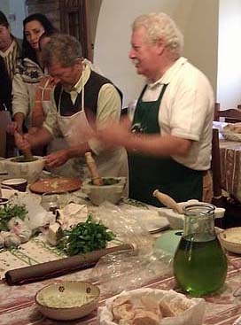 “Sono nato a Casalmorano vicino a Soresina, dove mio nonno era fattore. Nella cascina esistevano due grossi mortai di marmo che servivano a pestare il sale destinato agli animali, era compito/gioco di noi bambini pestarlo e frantumarlo, e a gennaio, per salami e cotechini, assieme al sale pestavamo le spezie. Nel 1986 arrivando in Liguria ho rivisto i mortai della mia infanzia: praticamente tutti i liguri ne posseggono uno, così grazie alla mia passione per le tradizioni locali ho cominciato la ricerca sulle antiche salse liguri. Poi l’associazione “Palati fini” ha indetto il campionato mondiale di pesto genovese al mortaio nella splendida sala del maggior consiglio di palazzo ducale, dove per le prime due edizioni mi sono piazzato tra i primi dieci. Questo mi ha dato lo spunto e la voglia per intensificare le ricerche sulle salse e ideare, piccoli segreti …, alcuni accorgimenti tecnici per la loro perfetta riuscita. Ora è un piacere condividere e insegnare il frutto delle mie ricerche . Ma basta parlare di me passiamo alle salse! Il pesto dopo la salsa di pomodoro è la salsa più conosciuta al mondo , la Liguria è più nota per il pesto che per Genova o Colombo … Questa salsa non cotta deriva dall’antica agliata, in genovese” aggiadda”, risalente al 1200 e usata dai marinai genovesi che pestavano l’aglio con pane bagnato nell’aceto per insaporire e disinfettare le carni secche dopo mesi di navigazione. Verso la metà dell’ 8oo l’aceto venne sostituito con il basilico, i formaggi e l’olio, poi della frutta secca, noci e nocciole, ma i pinoli diedero alla salsa il giusto equilibrio con il loro gusto resinoso. Una curiosità il primo formaggio era un olandese stagionato poi finalmente arrivarono il parmigiano e il pecorino sardo. La pasta più adatta è la lasagna larga – 15 cm per 15 – i “mandilli de sea” fazzoletti di seta come dicono i genovesi , un po’ di pesto nel piatto, un mandillo, ancora un po’ di pesto e un altro mandillo con sopra ancora del pesto … Mi raccomando non metteteli in forno, non insultiamo i profumi e aromi di questa delizia salsa fredda, tagliatela solo mentre la mangiate e sentirete che il pesto si infila tra le due sfoglie creando una sensazione che accarezza l’anima …”