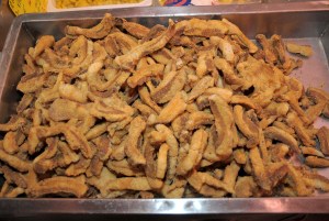 Grepole di guanciale, a dire ciccioli non mi ci ritrovo più di tanto, e pestöm, l’impasto fresco del salame, questi i miei due acquisti. Le prime derivate da una parte “nobile” per quell’uso, di certo non utilizzata per quei ciccioli pressati che non nascondono la loro assenza di qualsivoglia componente carnosa. Giusto equilibrio tra la parte magra e quella grassa, croccanti e gustosi, basta non abusarne per evitare sensi di colpa, mi suggeriscono due utilizzi: la loro aggiunta, tagliati a piccoli pezzi  – ma qui vengono proposte anche “le briciole” -, nel paiolo dove la polenta è praticamente a fine cottura, o messi nella pasta del pane con una punta di zucchero per assicurare il colore dorato al fragrante panino che se ne ricaverà. E il pestöm? Possiamo farne delle polpettine appena schiacciate che cuoceremo sulla griglia, al calore delle braci, oppure utilizzarlo per preparare un sugo, trito di sedano/carota/cipolla, pomodoro, vino rosso, chi lo ama una foglia di alloro o una punta di spezie, per condire della pasta: bigoi o pasta corta. L’ha in carta Stefano Cerveni al nuovo Due Colombe, l’aveva Vittorio Fusari al mitico Volto se ben rammento.