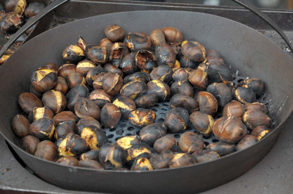 Vero, le caldarroste roventi abilmente messe in un cono di carta e l’immancabile pane ad avvolgere lo “strinù”, la salamella per i camuni, di suino o “misto”. Peccato non trovarlo, parlo del più robusto panino, per le strade, intermezzo certo più piacevole di alcune proposte studiate a tavolino e riprodotte con invidiabile precisione, e cupa monotonia, in ogni parte del mondo “civile”. Peccato ancora che non sempre qualità del pane e del suo contenuto siano all’altezza delle nostre aspettative. Le caldarroste poi ci portano, per eguale frutto di partenza,  a un dolce in via d’estinzione di cui scopro commoventi dettagli:
