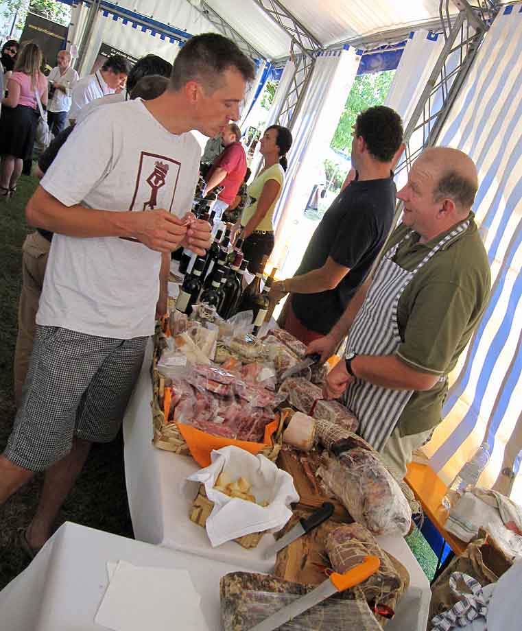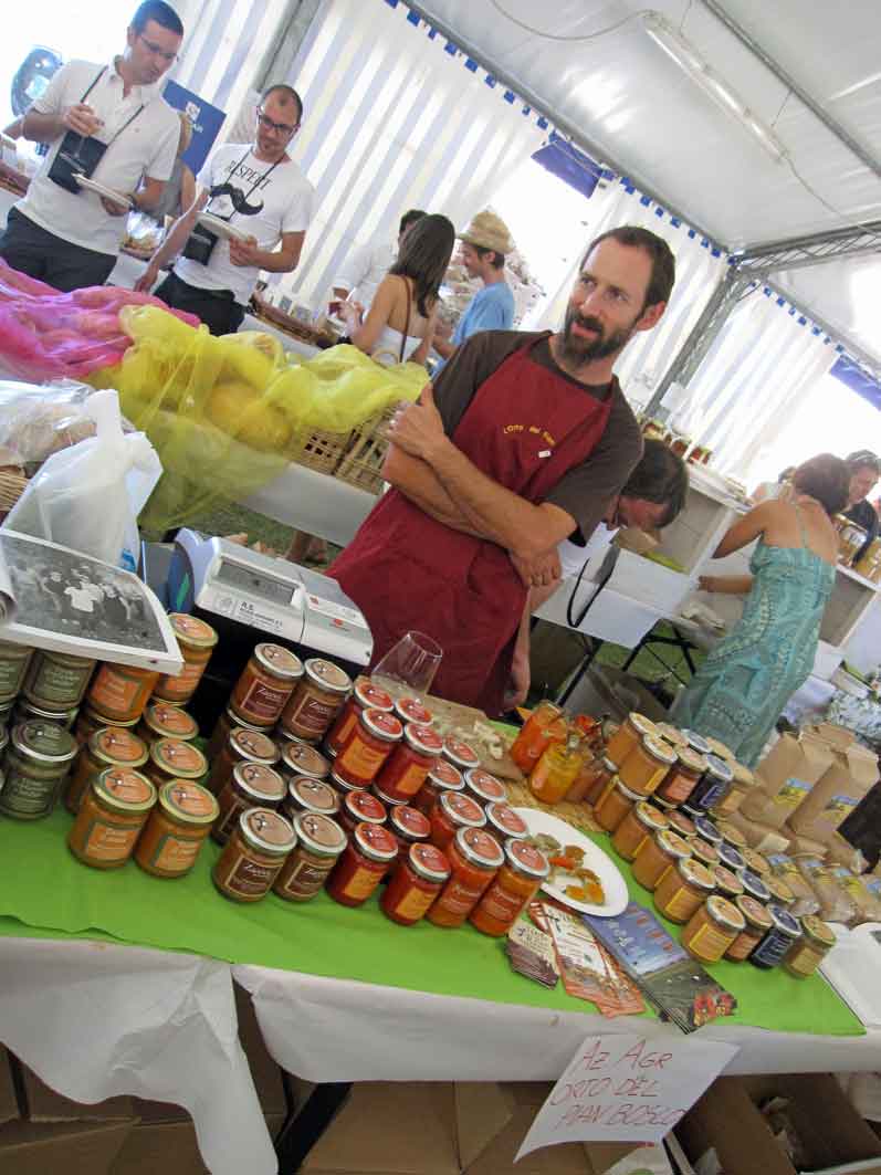 Che sarebbero queste ore quasi sempre infuocate data la stagione se lo sguardo non potesse incontrare Signore del vino o dell’olio come Elena Parona – La Basia – o Patrizia Rampa – Il Brolo -, oppure senza il piacere di stringere la mano a Cristiana Galasso di Feudi d’Ugni. Di nuovo vogliamo scendere a terra, toccare “con palato”, Linda Nano – che piacere averti conosciuto personalmente dopo le tante condivisioni, i tanti “mi piace”, i dialoghi mediati dalla tastiera su fb – mi presenta e raccomanda fratello e sorella savonesi : Teresa e Giovanni Giacobbe. Nella loro macelleria/salumeria di Sassello preparano testa in cassetta classica, alle mele e cannella, alle scorzette di limone e arancia in un crescendo di sapori, sino ad arrivare all’apoteosi di una pancetta che spiazza la maggior parte di quelle da me provate in una mezza vita di assaggi. E solo ora mi rendo conto di avere “saltato” il lardo battuto agli aromi …