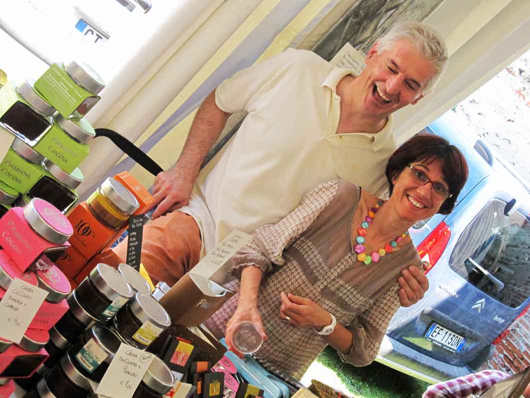 Veniamo al vino, in particolare ai vini “rifermentati in bottiglia con presenza finale dei lieviti esausti”. Lontani anni luce, sia concettualmente che come sensazioni organolettiche, dai vini spumantizzati in autoclave ma anche da quelli elaborati con metodo classico come il Franciacorta. Hanno partecipato, portando alcuni loro prodotti per la degustazione, Luca Ferrero – Bele Casel -, Ernesto Cattel – Costadilà – e Mirco Mariotti – Az. Vitivinicola Fondo Luogaccio – che è stato prezioso aiuto nel presentare l’incontro (e che ringrazio con papà Giorgio per la rinfrescante sorpresa del sorbetto di albicocche e saba e della “neve nel bicchiere …”). Momento di accesa ma civilissima discussione il possibile approccio a questi vini che l’azione ad oltranza dei lieviti lascia estremamente secchi e con un corredo di profumi e sapori altamente identitario e variegato al tempo stesso. Per Luca è preferibile un approccio “morbido” in tutti i sensi, con i prosecchi filtrati e dotati di un residuo zuccherino che rende più “facile”, almeno all’inizio, l’avvicinamento a tipologie più particolari, per Ernesto invece, che propone solo prosecchi “Sur Lie”, il diretto e immediato contatto con questa modalità di elaborazione è la strategia d’elezione, l’unica possibile. Non essendo questo il post adatto per un approfondimento della questione mi trovo a dire che riconosco validità in entrambe le posizioni pur sentendomi più vicino all’approccio graduale di Luca. Ribadisco comunque che entrati in confidenza con queste bottiglie prima o poi se ne sente quasi il “bisogno” fisico e mentale, cosa che difficilmente accade per tipologie più consuete: è sensazione che conosco bene e che vivo, ad esempio, nei confronti dei Lambic, le birre belghe a fermentazione spontanea. Termino qui con la raccomandazione di visitare il blog dei Sovversivi del Gusto, Associazione e realtà che vorrei davvero di lunga e sempre più ricca vita, troverete l’elenco di tutti i partecipanti – ahimè il tempo e il caldo che hanno frenato gli assaggi dei tanti validi rossi presenti – informazioni aggiornate e fotografie che danno una pallida idea di quanto sia stato piacevole e coinvolgente l’incontro. Un grandissimo “perdonatemi” ai tanti produttori non citati, li saluto idealmente parlando di due figure che hanno concluso la mia giornata: Claudio Pistocchi e la sua sempre emozionante Torta e Paolo Devoti con Elena – Passion Cocoa – ritrovarli con i Sovversivi è stato puro piacere.