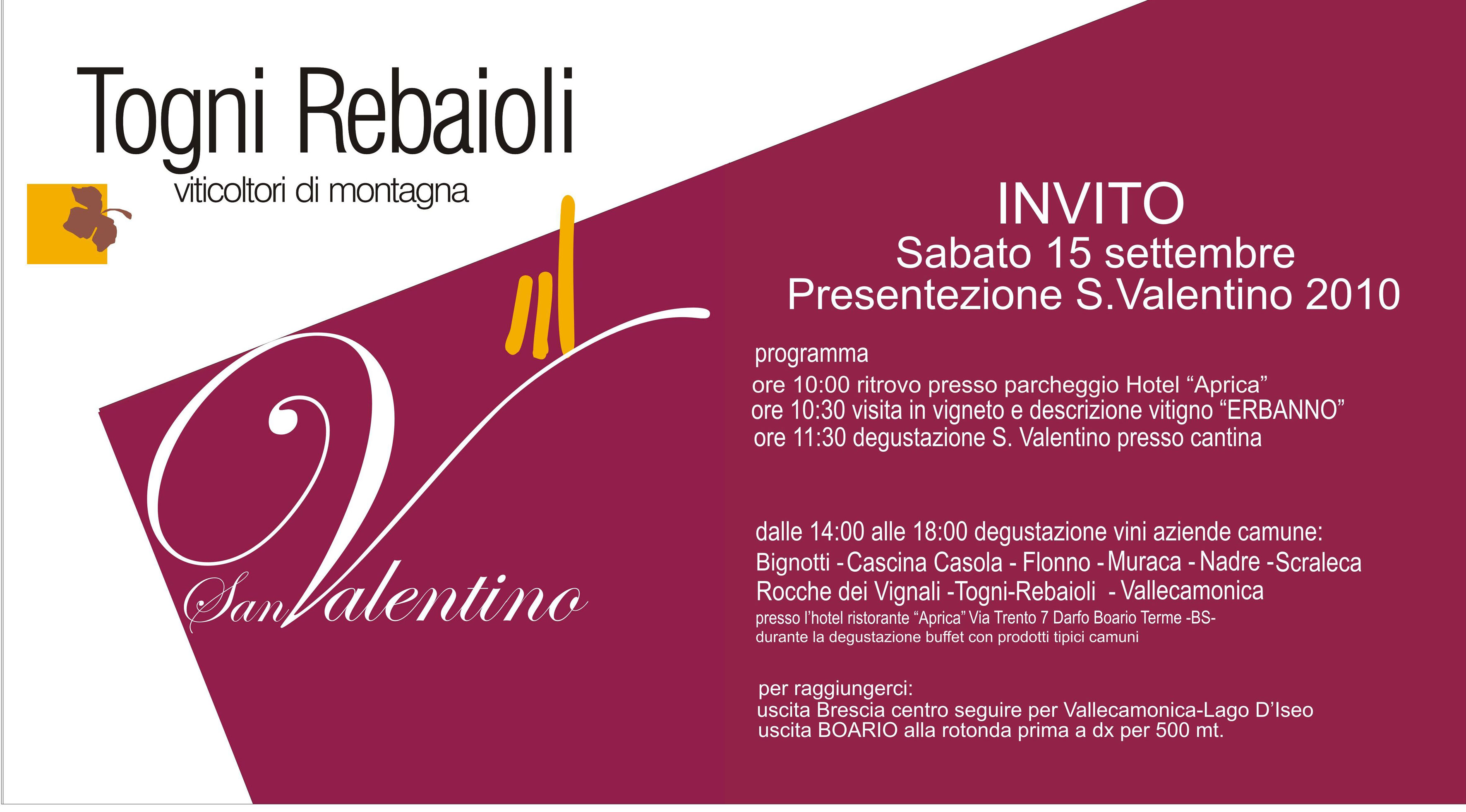 L’ordine in cui cito le aziende agricole e vitivinicole che hanno partecipato alla degustazione è quello riportato nella brochure consegnatami. Agricola Vallecamonica di Alex Belinghieri, conosciuto per i suoi bianchi in purezza, da solo Incrocio Manzoni il Bianco e il Passito dell’Annunciata, da solo Riesling Renano il Bianco delle Colture e i suoi rossi da Merlot, Marzemino e vitigni locali: in prevalenza nel Ciass Negher da tavola, in piccola parte nell’IGT. Discorso a parte per il Cru Storico, che sarà commercializzato a fine anno, metodo classico da vitigni locali a bacca rossa che ha goduto di un affinamento per 12 mesi  sui fondali del Lago d’Iseo (spesso ci si dimentica che questo lago bresciano “introduce” la valle). Cantina Bignotti, I Cultivar delle Volte con il Cultivar delle Volte rosso, primo vino aziendale seguito  dal Cultivar delle Volte “Collezione Fenocolo”, IGT da uve Merlot, Marzemino e Cabernet e dal loro primo bianco a IGT da uve Muller Thurgau con una piccola aggiunta di Chardonnay. Nella loro gamma, e dalle stesse uve,  anche un Brut: il Cultivar delle Volte Spumante V.S.D.Q. primo spumante della zona. Ultimo nato il Cultivar delle Volte Valcamonica Merlot IGT. Az. Agricola Cascina Casola che presentava al suo esordio il Pare, bianco da Incrocio Manzoni in purezza. Cantina Flonno, Soc. Agricola di Sandro Sorteni e Giacomino Lardelli, che conoscevo per il suo Grandimani Merlot in purezza, più volte degustato, dall’evocativa etichetta ora “accompagnato” dai recentissimi Rituale, 100% Marzemino, e Grandidoti, 100% Riesling Renano. Peccato non essere riuscito ad incontrare Sandro: mi riprometto di farlo al più presto. Azienda Agricola I Nadre, giovane realtà che mi ha sorpreso con il Cris 2009, loro primo spumante a metodo classico, principalmente da uve Pinot Nero con piccole aggiunte di vitigni a bacca bianca. Anche questo vino è di recentissima proposta. Si affiancano alcune annate di Via Lunga – 2006, 2007 – vino a base di Cabernet e Merlot. In serata, durante la piacevole cena al Rosso di Sera di Alberto Giurini, che ha chiuso per noi l’evento, ho provato anche il 2008. L’azienda elabora anche un bianco, il Barlume. Rocche dei Vignali, Soc. Coop. Agricola, tra le fondatrici del Consorzio Vini Valcamonica con la Cantina Bignotti e Togni-Rebaioli. Baldamì a base di Marzemino e Merlot, Assolo, Merlot in purezza, Camunnorum, il loro fiore all’occhiello che vede utilizzati Merlot, Marzemino e Cabernet e Coppelle, un bianco a base Incrocio Manzoni, Riesling Renano e Chardonnay costituiscono la loro gamma. Az. Agricola Scraleca, qui giustamente presente con un bianco, il Griso, Incrocio Manzoni 6.0.13 in prevalenza e Riesling per la restante parte, è presente nei miei ricordi per due oli extravergini “estremi” come collocazione geografica e un’ottima farina da polenta. “Last but not least” il “padrone di casa”, Togni- Rebaioli con il protagonista della giornata, il S. Valentino, 100% Erbanno, vitigno autoctono felicemente interpretato da Enrico. C’erano anche il Lambrù, Marzemino, Merlot e Barbera, il 1703 da uve Nebbiolo in purezza, il Vidur una Barbera sempre in purezza, il Rebaioli Cav. Enrico, 100% Merlot e il Martina, dedicato alla figlia, 100% Schiava.