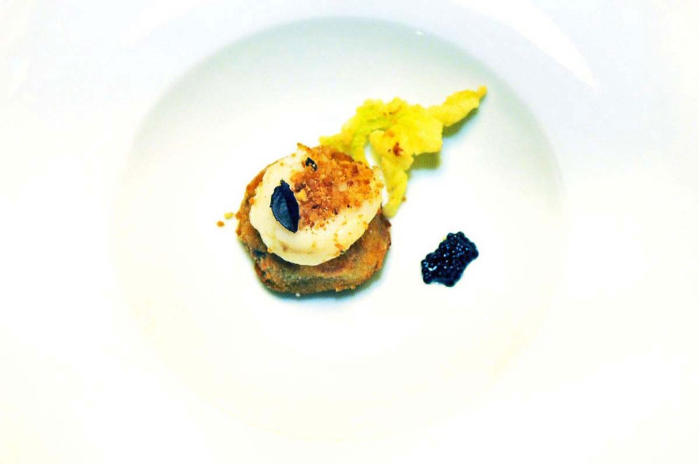 Crocchetta di caponata di melanzane e ricotta, capasanta gratinata con tarallucci sbriciolati, cipollotto, uova di aringa. Si parte con questo benvenuto che fornisce le prime indicazione sul concetto di piatto del Rolly. Rispetto del prodotto, cotture attente. I tarallucci sono, ovviamente, “home made”.