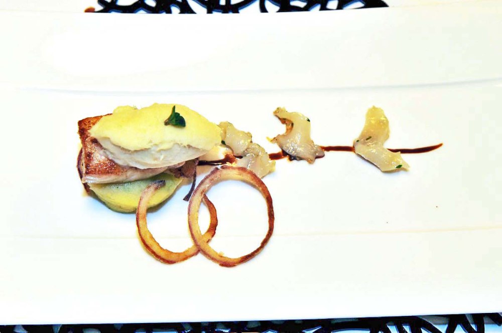 Il cubo, la trippa e il mantecato di baccalà, su insalatina di patate al pizzico e cipolla di Tropea. Gioca facile la portata di pesce principale: adoro il baccalà in tutte le sue forme e preparazioni. Un poco resistente il cubo, parte centrale di un filettone, ma di ottimo sapore ripreso dal mantecato e completato dalla sottostante “schiacciata” di patate appena piccanti. Deliziosa nella sua consistenza la trippa, ancora una volta ineccepibile la “frittura” degli anelli di Tropea.