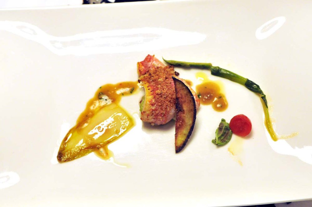 Filetto di triglia di scoglio con una leggera farcia di pecorino e menta, verdure brasate. Piatto corretto che tuttavia non mi emoziona particolarmente. Stefano mi parla di una variante invernale con l’uso accorto della verza: d’istinto sono già proiettato in quella direzione.