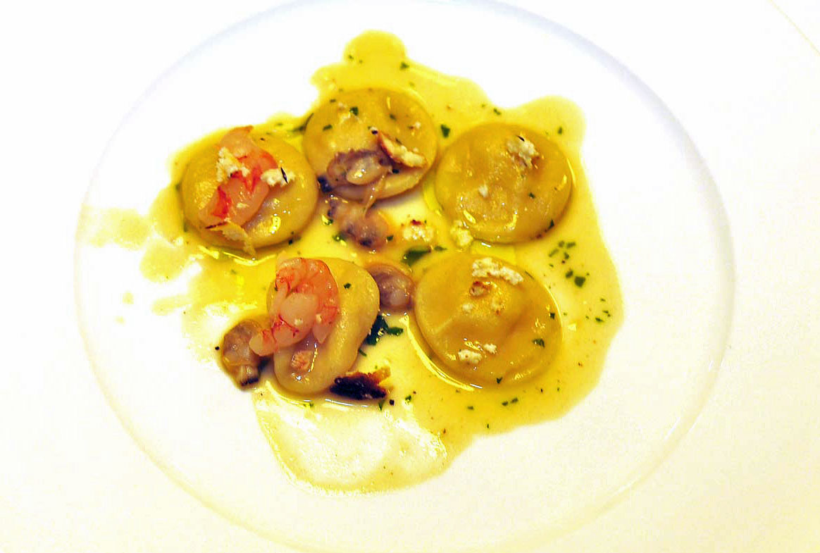 Gnocchi di patata ripieni di purè affumicato; vongole, gambero, e spolverata di ricotta infornata. Grande. La “doppia” presenza della patata a creare una sorta di “gnocco/ raviolo” assicura al gambero appena scottato una base assolutamente efficace. Le vongole e la loro acqua danno sapidità ad una tavolozza di equilibri (la ricotta “infornata”!) del tutto riuscita.