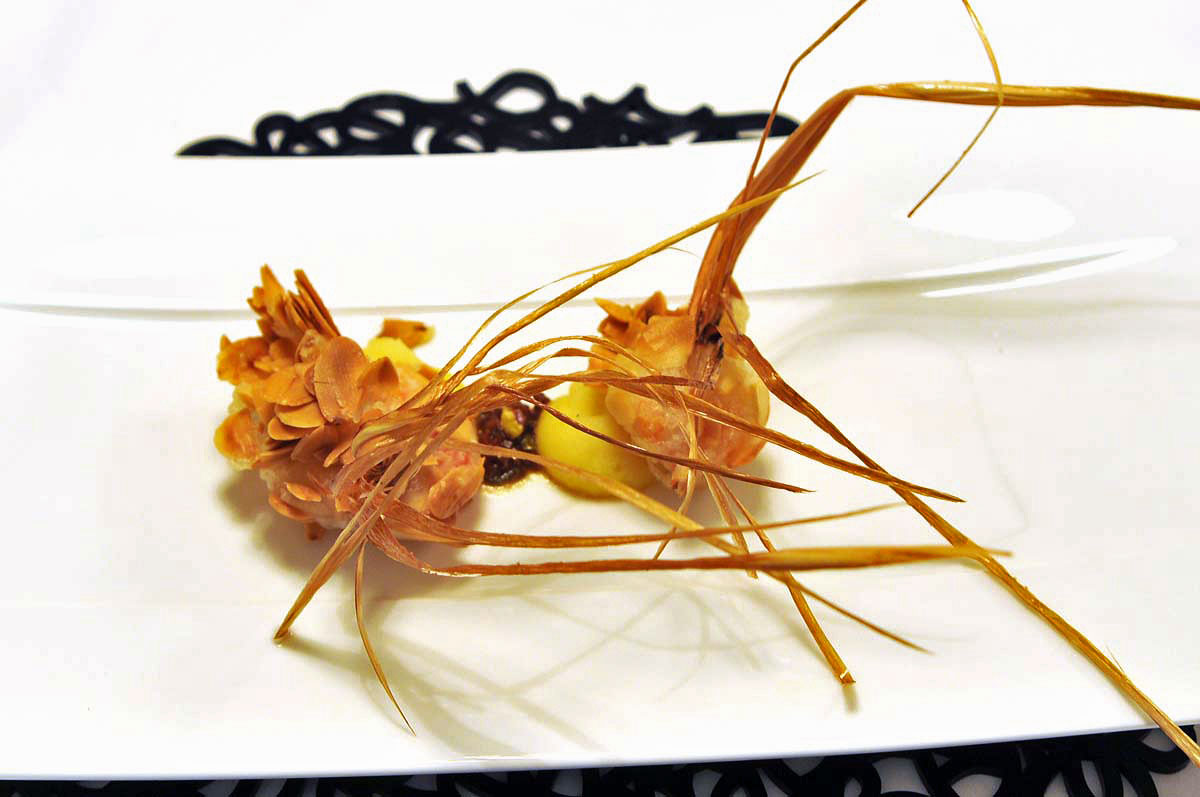 Gambero rosso in tempura di mandorle, purè affumicato, pesto alla trapanese. Il piatto con cui la cucina del locale inizia a conquistarmi. Il gambero è sodo nella sua crosta di mandorle a lamelle, il “ciuffo” di lemon grass conferisce profumi agrumati e ricordi di zenzero che ben si sposano al fritto, oltre a caratterizzarne l’impatto visivo. Gradevole il purè affumicato a cui conferisce tono il rosso – pomodoro – pesto alla trapanese.