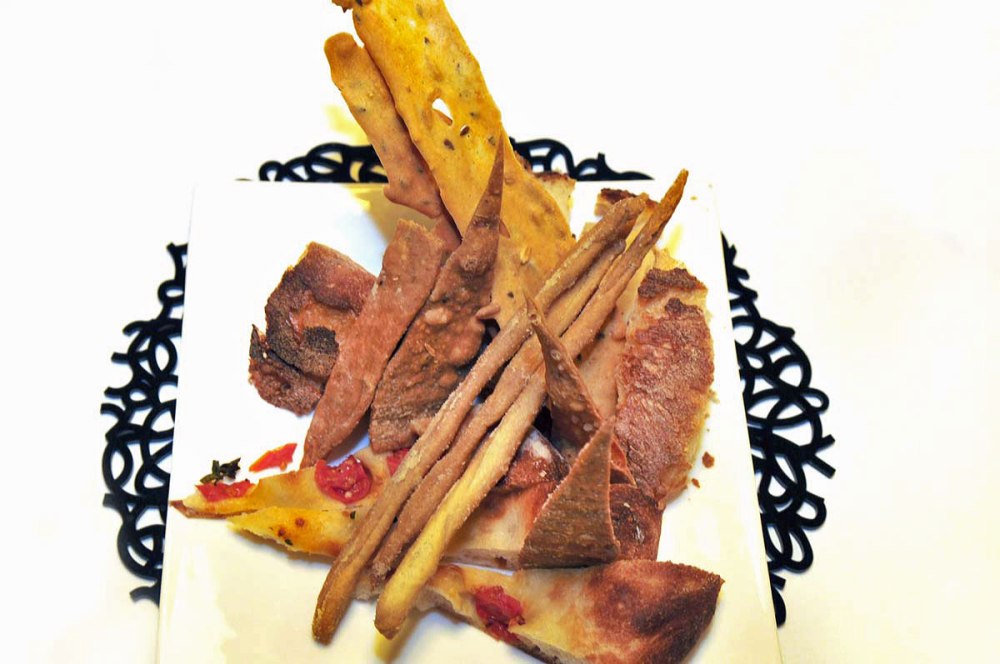Lo avverti sin dalla proposta del pane: triangoli di focaccia, grissini, croccanti “vele”, pani tagliati a bocconi. Regnano qui farine biologiche macinate a pietra, lievito madre, grosse pezzature. Assenti i piccoli pani variamente aromatizzati che caratterizzano altri cestini. “Il pane è quello grande, ben cotto e lievitato, che tagli per offrire” questo il suo pensiero.