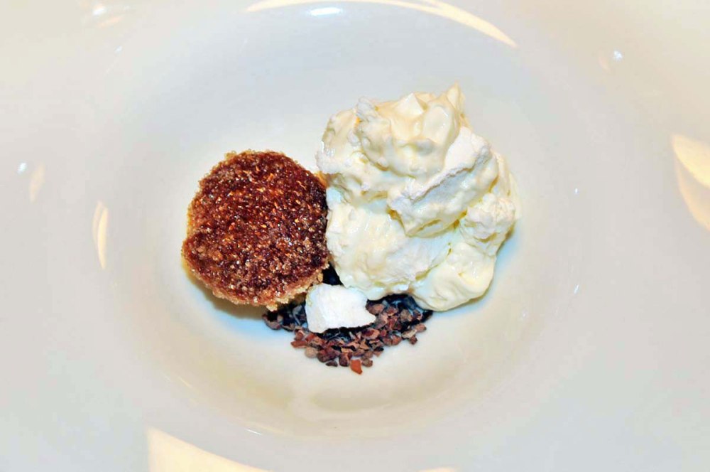 Mousse al mascarpone, biscotto alla panna, meringa e grue di cacao. Un dessert che senza dichiararlo occhieggia alla “destrutturazione” di un più classico Tiramisù: il biscotto è bagnato nel caffé, la meringa all’italiana interrompe il tessuto della mousse, le grue di cacao danno un poco di croccantezza e tono amaro. Goloso.