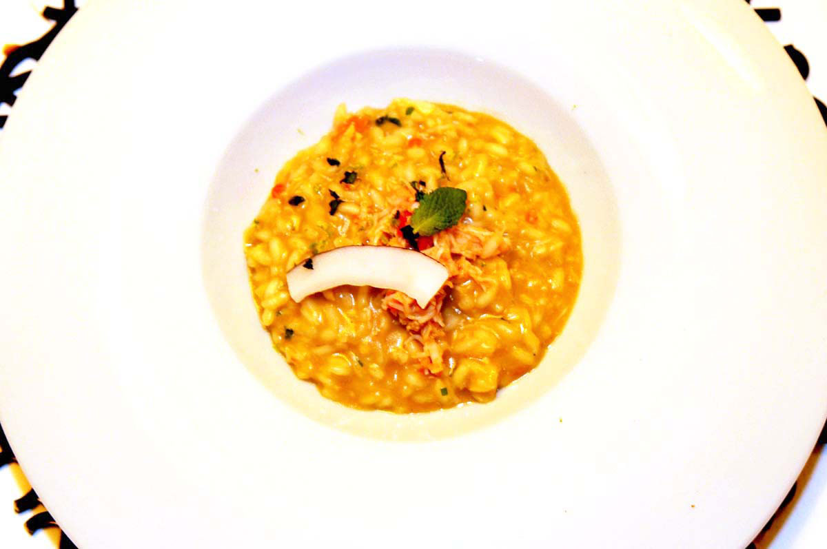 Il risotto con la granseola il profumo di menta e lime, spolverata di cocco. Tra iniziale perplessità e quasi immediati ricordi – gamberi e cocco in un ristorante tailandese di livello a Francoforte – il risotto si presenta con buona cottura e sapori ben amalgamati.