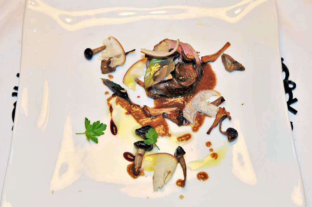 Rotolo di carrè di agnello arrosto accompagnato dai funghi del sottobosco. Portata di carne per onorare il Sassicaia 2001 offerto dal’ospite che ha “lanciato” l’idea di questa splendida cena/degustazione. I profumi, nota pressoché costante di tutte le preparazioni del Rolly, sono la prima carta efficacemente giocata: il sottobosco pare materializzarsi nel piatto, con funghi di vario tipo cotti e lamelle di porcini a crudo. Il carrè, disossato, cotto a bassa temperatura e “finito” avvolto nel guanciale, è tenerissimo, succulento nella sua riduzione di vino rosso. Altra portata che si ricorda con sommo piacere.