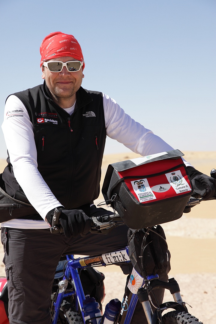 Nasce così, poco alla volta, l’idea di una spedizione nel deserto egiziano con lo scopo di promuovere la bicicletta come mezzo di mobilità sostenibile, dimostrare che il tutto, pur in situazioni talvolta estreme, è alla portata di una persona assolutamente normale, testare le sue scelte, nonché strumenti ed equipaggiamento in quelle condizioni. Promuovere infine un turismo sostenibile in quelle aree. Ingredienti il suo percorso di due anni, una MTB Standard, quella che usa abitualmente, equipaggiata con pneumatici adatti al terreno, equipaggiamento per circa 25 kg di peso di cui parte costituito da cibo assolutamente naturale e per quanto fattibile composto da prodotti locali integrati da alcune derrate preparate e fornite da validi «artigiani del cibo» bresciani. Questo uno degli aspetti che ho, per la natura del blog, cercato di conoscere il più possibile durante la nostra conversazione.