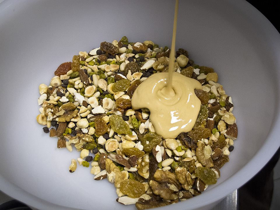 à dei tubetti di latte condensato. A spezzare tante sensazioni dolci, una buona dose di Grana Padano confezionato in piccoli blocchi. Le borracce contengono acqua, locale commercializzata da una realtà italo-egiziana, e acqua integrata da succo di limone, miele, zucchero e fruttosio. L’integratore «naturale» prevede la sostituzione del succo di limone con aceto di miele. L’apporto energetico giornaliero è attorno alle 10.000 Kcal.