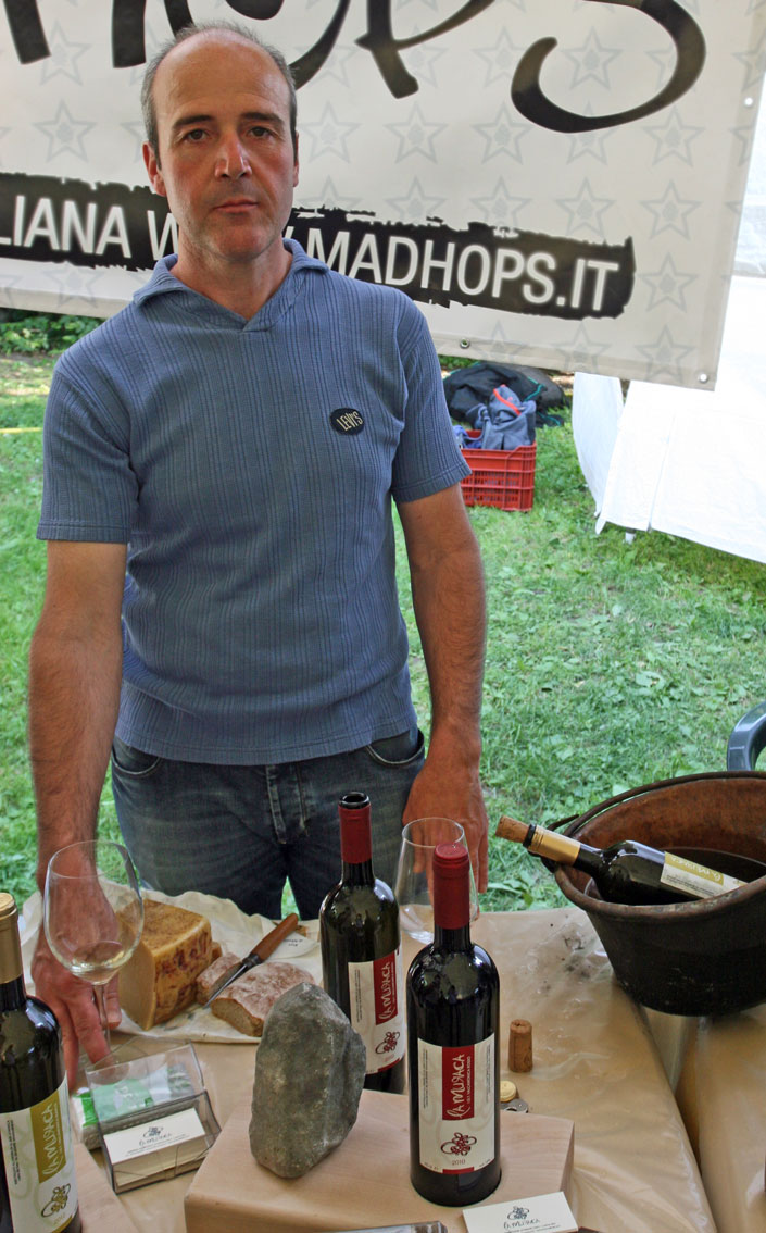 hobby? – questa azienda agricola di Cerveno è tra i promotori dell’evento (A quando una piccola pagina sui social network per far conoscere la sua realtà?). Giusto due parole, mi dovrò far perdonare, con i Bignotti di Cultivar delle Volte (mi dicono anche di future generazioni in arrivo: come augurio che seguano l’opera di crescita della vite in Valle Camonica…) per poi passare al… Posto vuoto di Enrico Togni ideatore principale, con Massimiliano Andreoli del Piccolo Lord di Piamborno e i ragazzi del KAG di Pisogne «rappresentati» da Giuseppe Ascrizzi, dell’intera mostra, lui l’errabondo produttore dell’azienda Togni-Rebaio