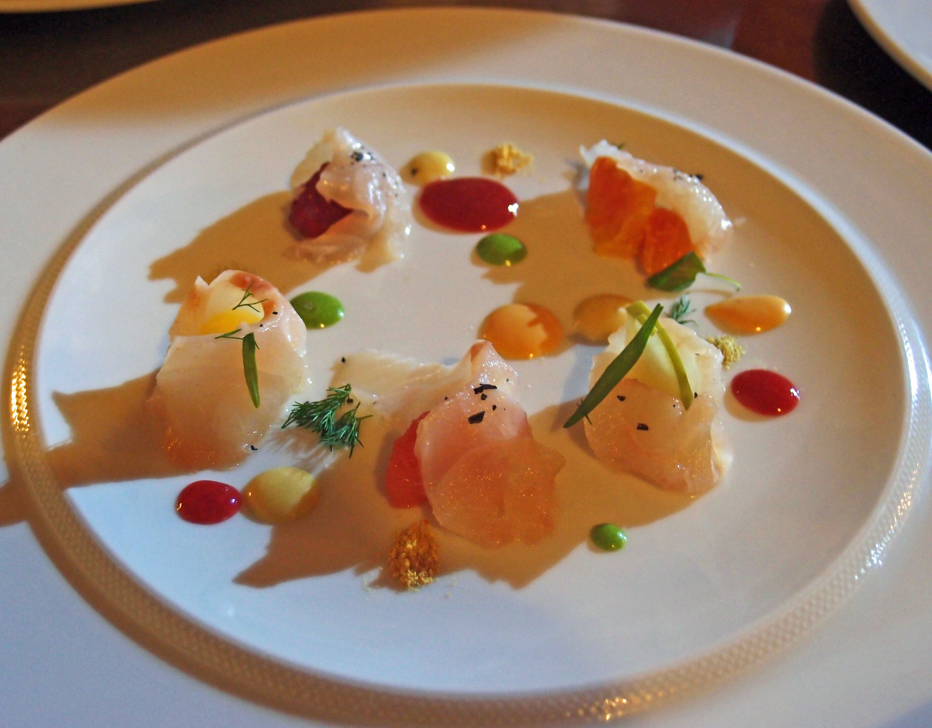 La sensazione da me avvertita è stata quella di un «crescendo » musicale, tralascio il Pirlo scomposto, che in tutta onestà mi ha divertito ma non gratificato – lo zucchero carbonico dava comunque tanta dolcezza e il Campari sferificato non era particolarmente percettibile – per dare il via alle danze con la Tartara di Branzino dove il croccante aromatico dei finocchi dava gradita freschezza, seguita dal Carpaccio Fantasia, ancora crudità di pesce che si abbinava ai sapori di frutti come la mela verde, la fragola, il pompelmo rosa, il kiwi… Dove ciascuno poteva giocare cercando l’abbinamento a lui più congeniale.
