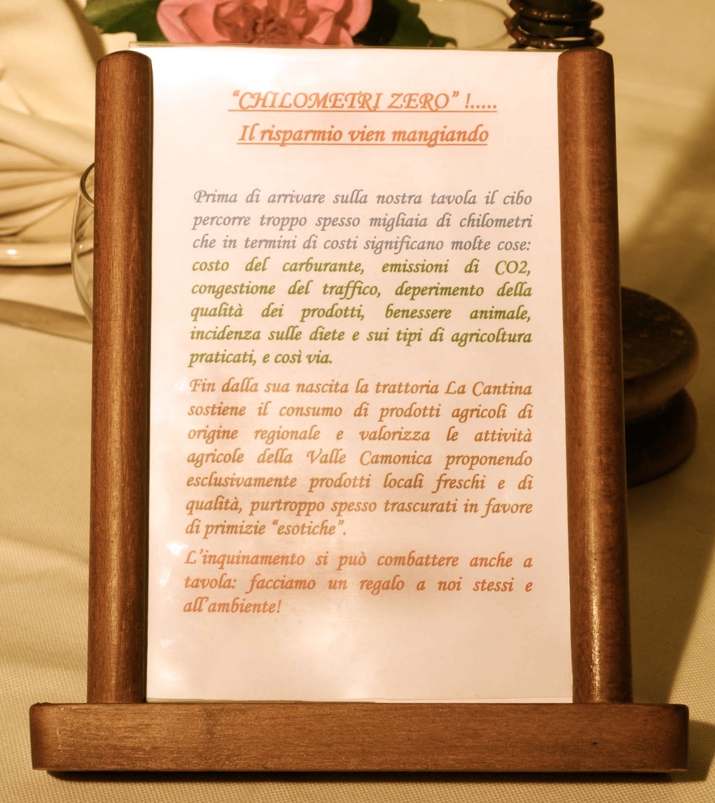 Aborro, ho in orrore alla Mughini, la maggior parte delle etichette che vogliono liquidare mondi con poche, solitamente due, parole. A questa mia idiosincrasia non poteva sottrarsi il «km 0» della ristorazione o, meglio, l’uso che certa ristorazione ne fa ancora adesso. Si sottrae quindi l’immagine che riporta il piccolo manifesto presente, almeno un tempo, su ogni tavolo della Cantina di Esine, non certo perché considero verbo ogni sua affermazione – non da ieri Dario Bressanini ha provveduto da par suo a demolirne buona parte, molto tempo prima che Dissapore desse spazio alle parole di Matteo Metullio della Siriola di San Cassiano, giusto per riscaldare, fosse servito, le vampe agostane – quanto per l’intrinseca e provata onestà di come Oriana e Giacomo della Cantina di Esine hanno da sempre affrontato il tema. Perché per me km 0, di là dell’inflazionata espressione, significa scoprire, talvolta riscoprire, quando di buono e interessante hai alle porte del tuo ristorante senza, magari, saperlo. Significa, sempre per me, sbattersi un poco, lo so che siete super impegnati e avete orari da novelli stakanovisti, per andare, anche, oltre i patinati cataloghi delle distribuzioni di alta qualità (ché servono anche quelli).
