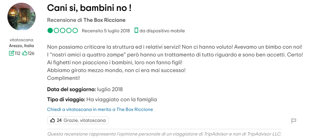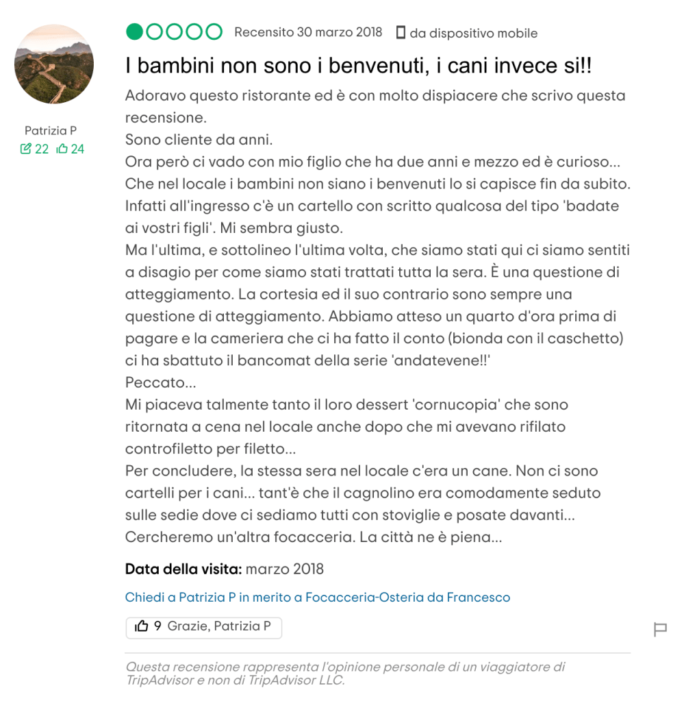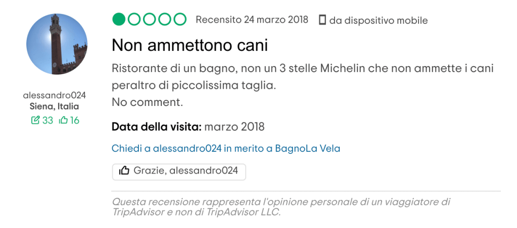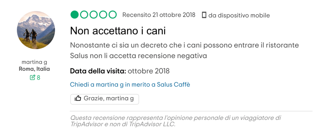 Vorrei, ma so che è utopia, non più vedere recensioni e commenti come questi: «… non sono amici dei cani …», «ho un piccolissimo chihuahua nell’apposita borsa per cani. Viene subito una signora, … , a dirci che per il cane serve la museruola altrimenti non può stare. Faccio presente … che il cane è chiuso in una borsa e che non può dare fastidio anche perchè non si vede nemmeno e che inoltre penso non esista nemmeno la museruola per un cane minuscolo di 1 kg!», «… proviamo a chiedere se per caso, considerando la taglia del ns cane (una docile barboncina di 4 kg) facevano eccezioni ma niente…personalmente lo ritengo inammissibile.», «Inaccettabile … non accettano i cani, nonostante il Regolamento di Polizia Veterinaria preveda il loro libero accesso nei locali pubblici.», «Sentirsi dire di lasciare fuori il cane per noi è stato un segnale di grande inciviltà e di scarsa sensibilità verso gli animali». Naturalmente accompagnati da punteggi minimi.