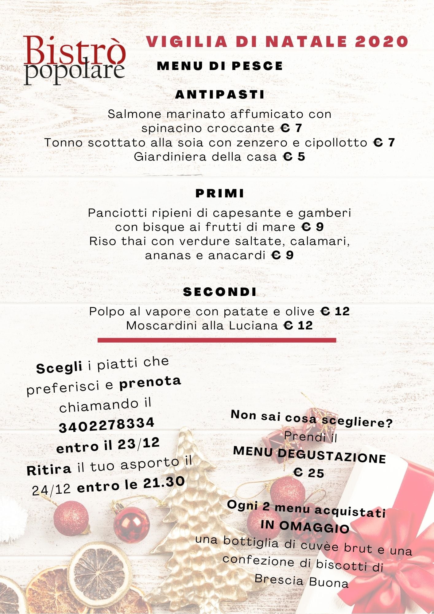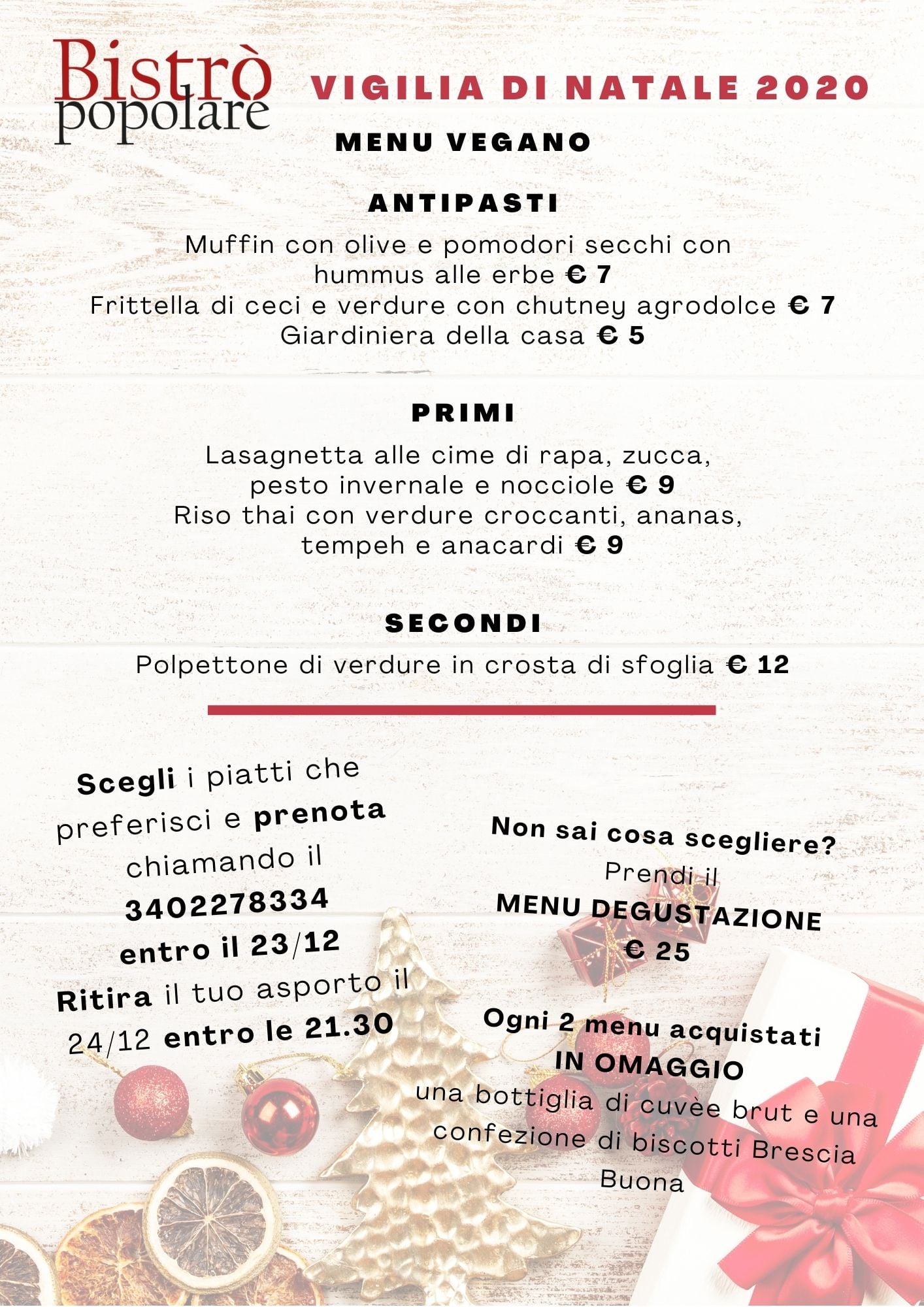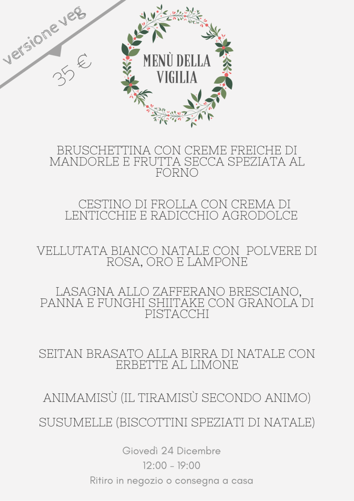 Animo Cucina Naturale propone per la Vigilia due menu, di cui uno veg e uno ittico. Giovani dalle idee chiare, Valentina e Davide, per niente integralisti. Li trovate a Brescia in viale Europa al civico 60, non direttamente sul viale ma sotto i portici che si affacciano a un parcheggio. Recapito mobile +39 375 5263539