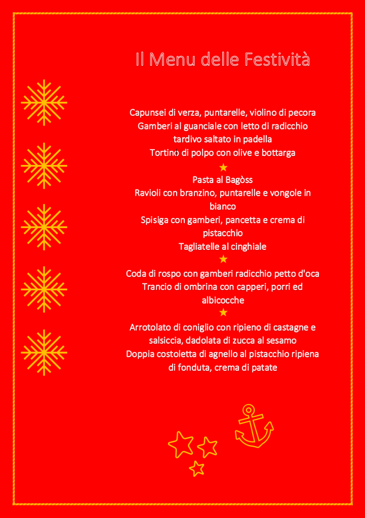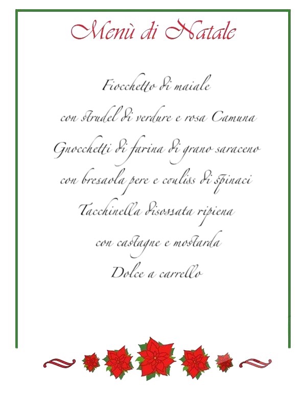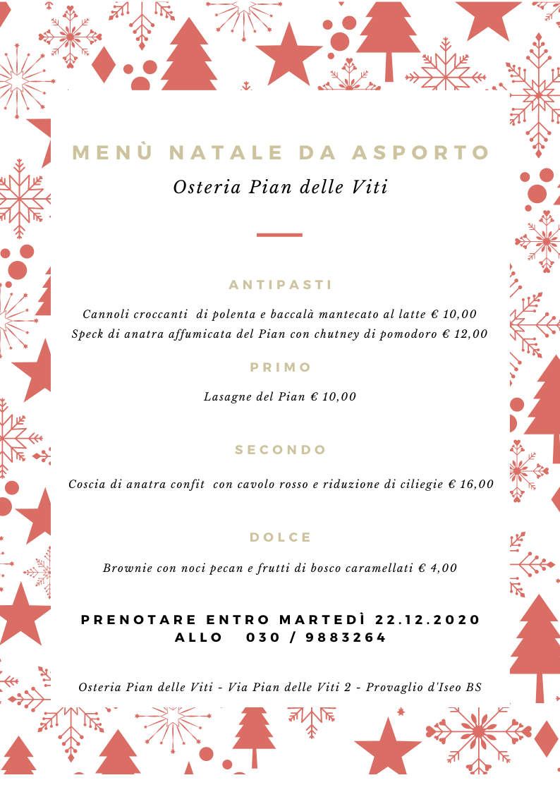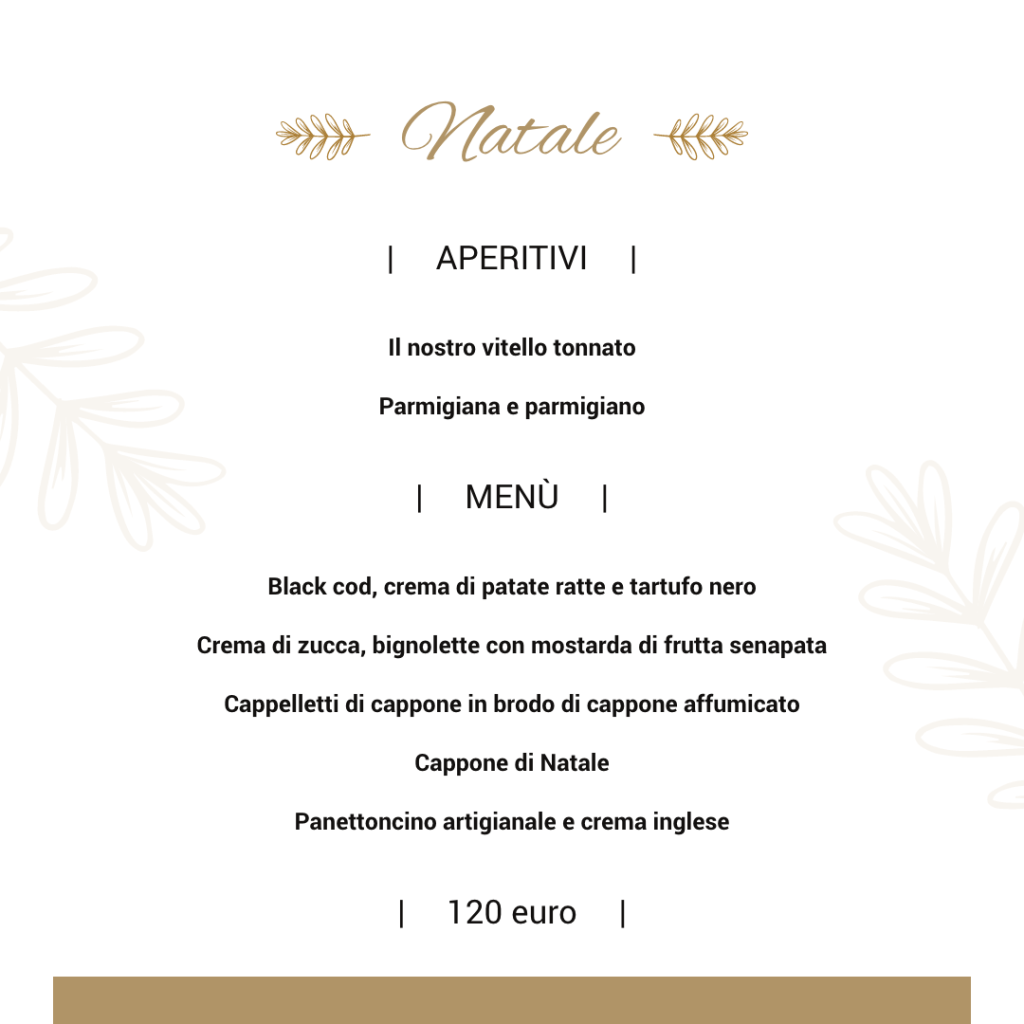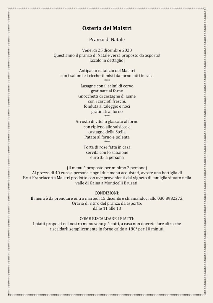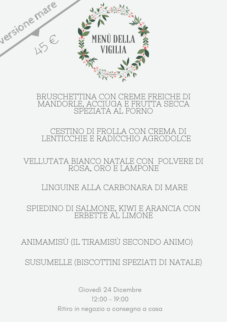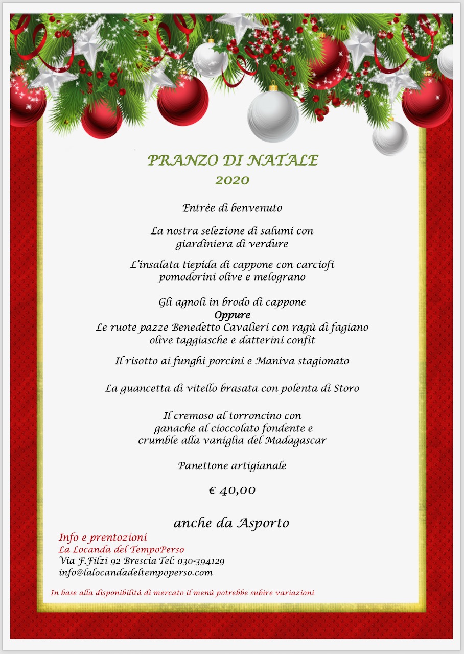 La maggior parte dei menu è stata reperita in rete e rappresenta un’omeopatica parte di tutto ciò che verrà proposto dalla ristorazione della nostra provincia, sia da asporto che per alcuni in loco, per le festività natalizie. Resto a disposizione come sempre di chi non voglia comparire in questo elenco che ha il solo fine di ricordare al maggior numero di persone possibile questa parte, a mio avviso fondamentale, delle nostre risorse… Invito ovviamente a chiamare i locali per accertarsi di modalità, condizioni, località raggiunte dall’eventuale servizio.