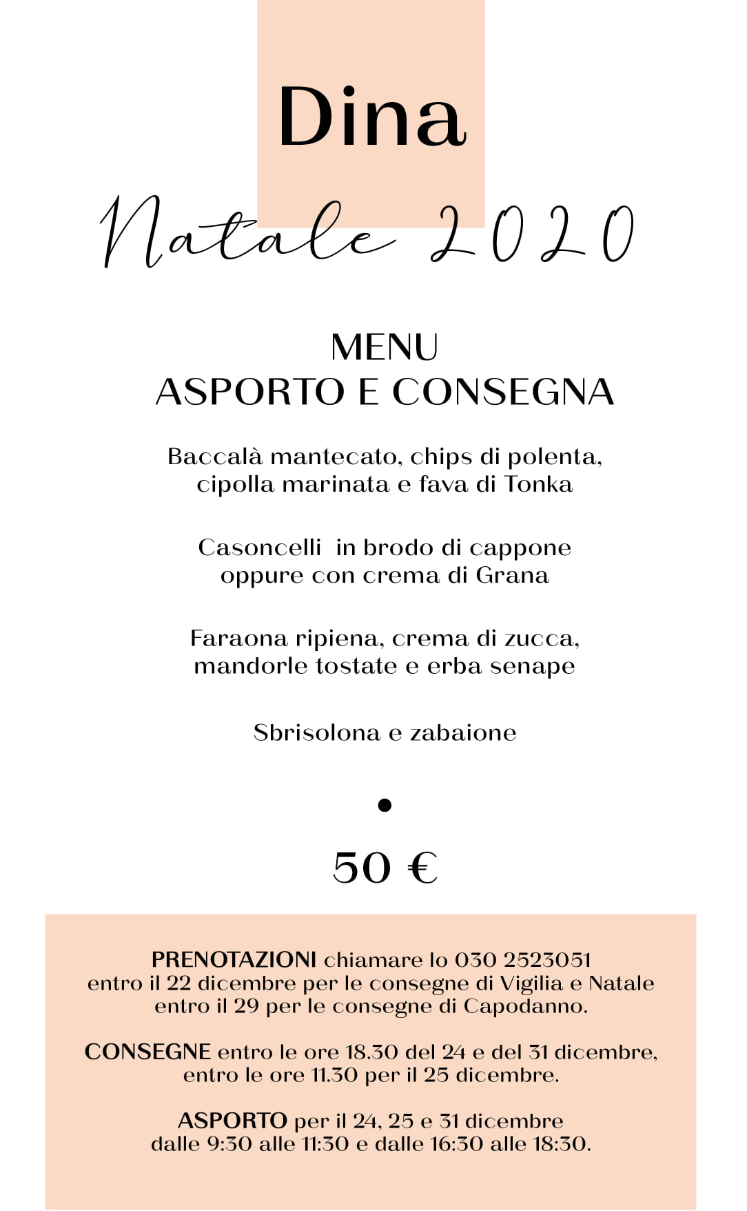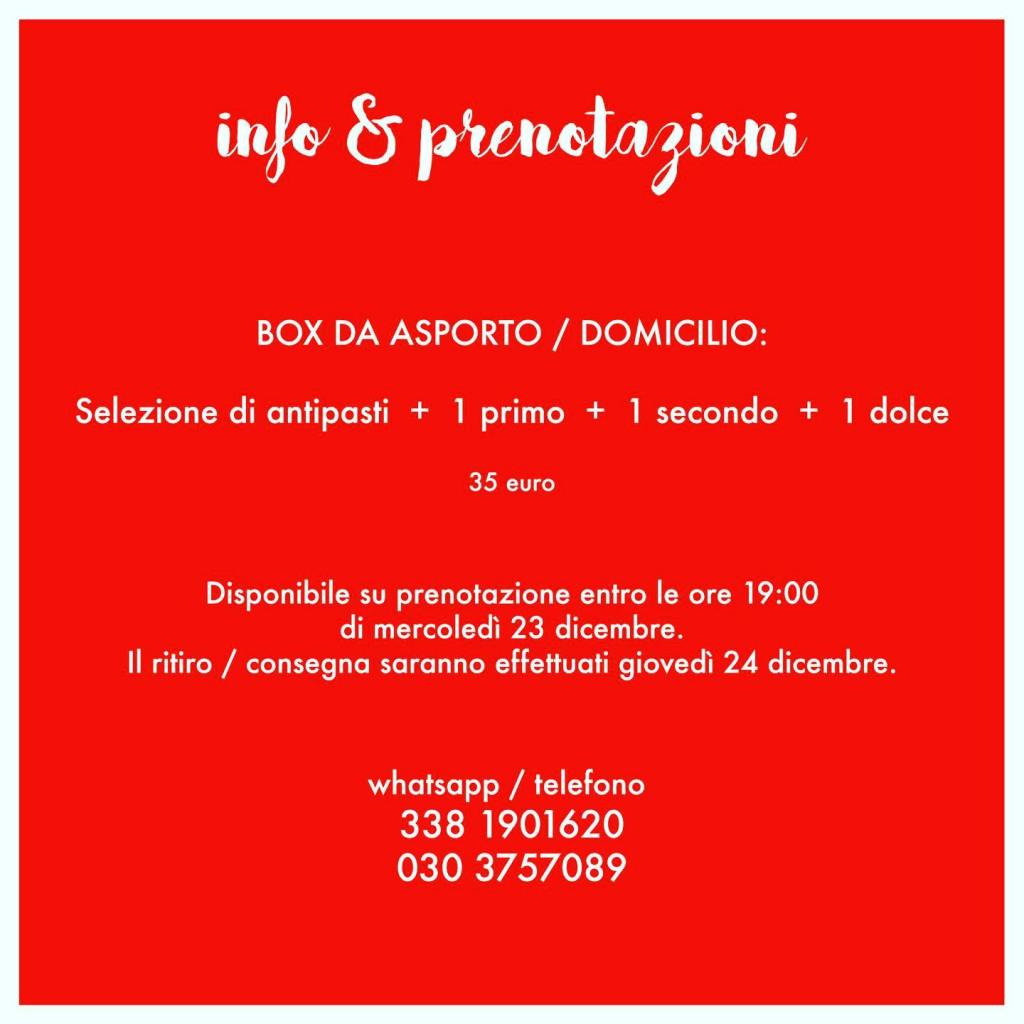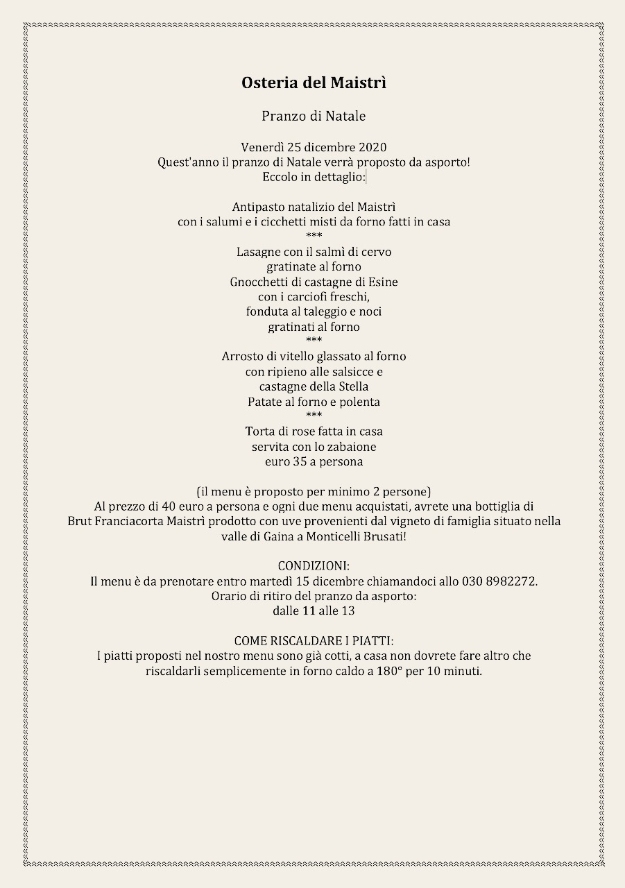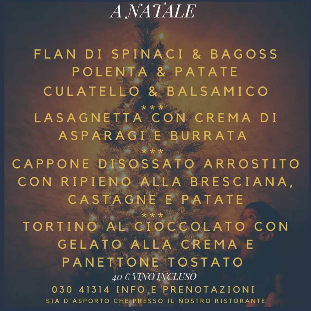 Osteria dell’Angelo è a Gussago in via Fontana 25, Emanuela Rovelli la cuoca e ostessa, con il figlio Federico, sommelier, in sala accanto al papà. Il menu d’asporto festivo è pensato il giorno di Natale, i numeri a cui prenotarlo o chiedere informazioni, vale naturalmente per tutti i locali, sono rispettivamente +39 030 2770139 il fisso e +39 333 7307996
