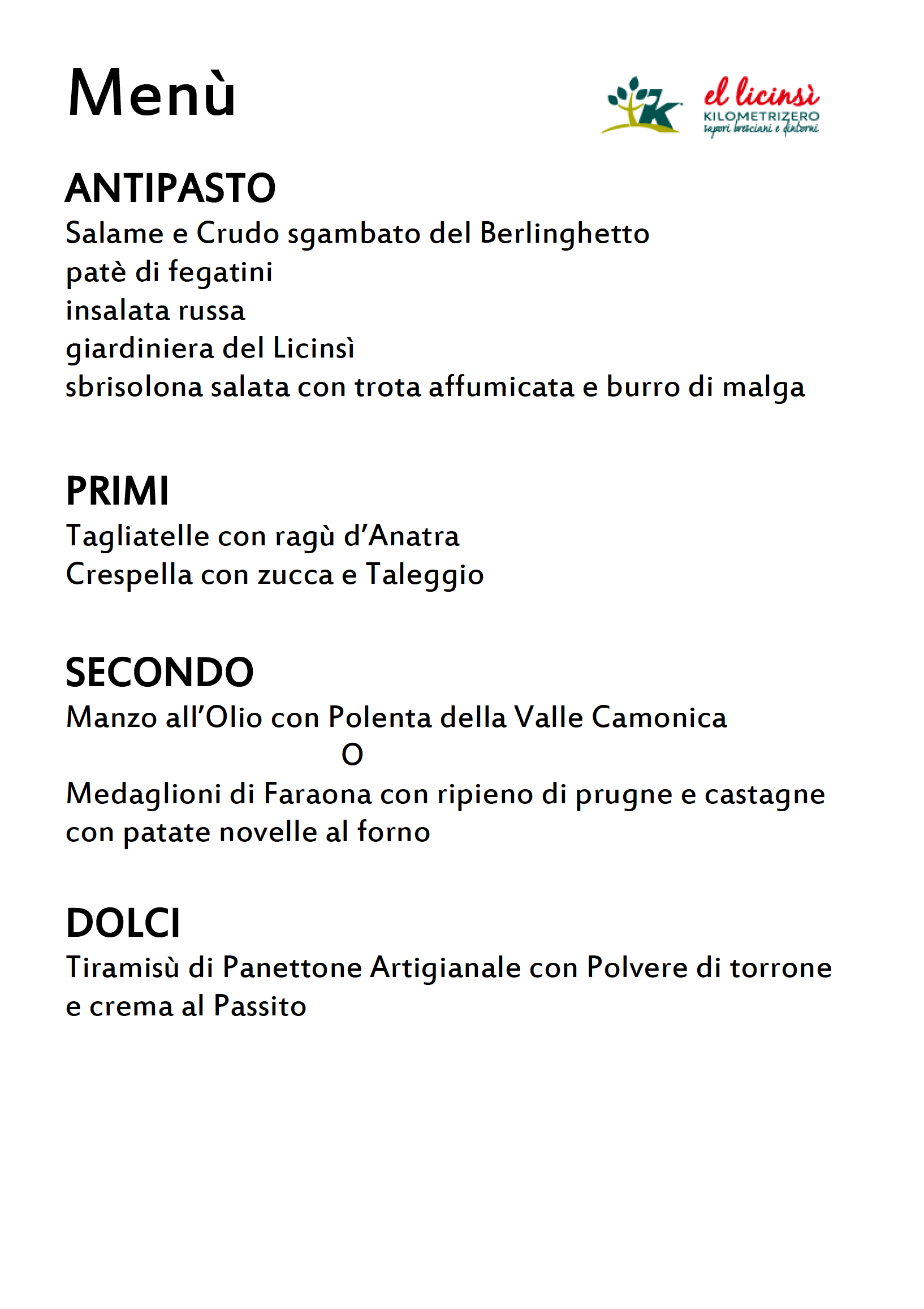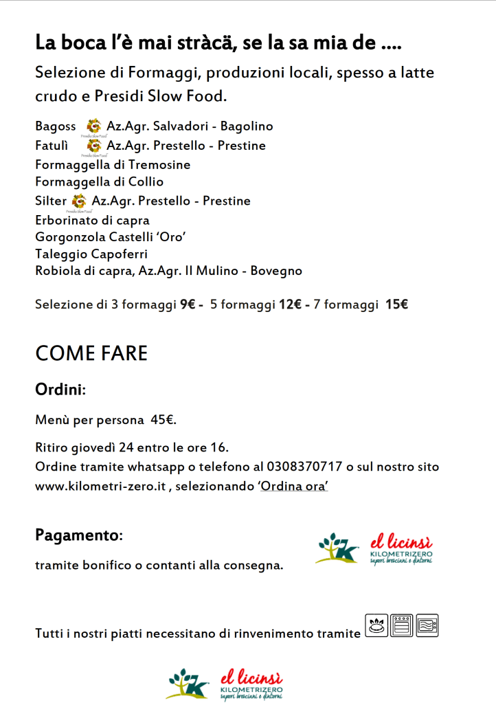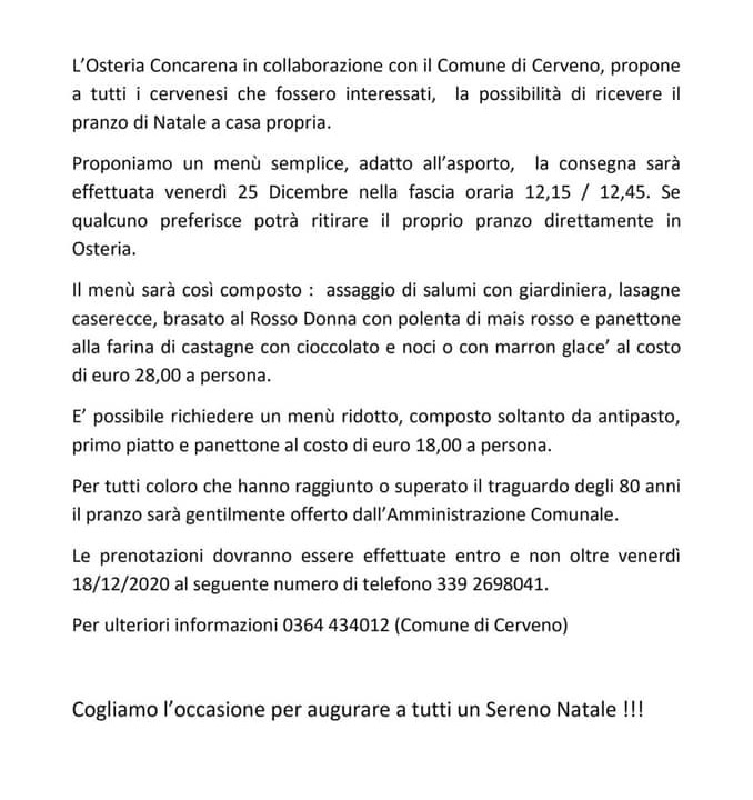 Osteria Concarena, fresca d’ingresso nella Guida delle Osterie Slow Food, per volontà di Flavia Rebuffoni e Alessandra Gallo vuole essere un centro di convivialità, d’incontro, di resistenza nel piccolo paese di Cerveno. Il loro è un piccolo/grande menu che, grazie alla collaborazione dell’amministrazione comunale, diventa dono natalizio per chi ha 80 anni e più… Potevo forse non citarli?