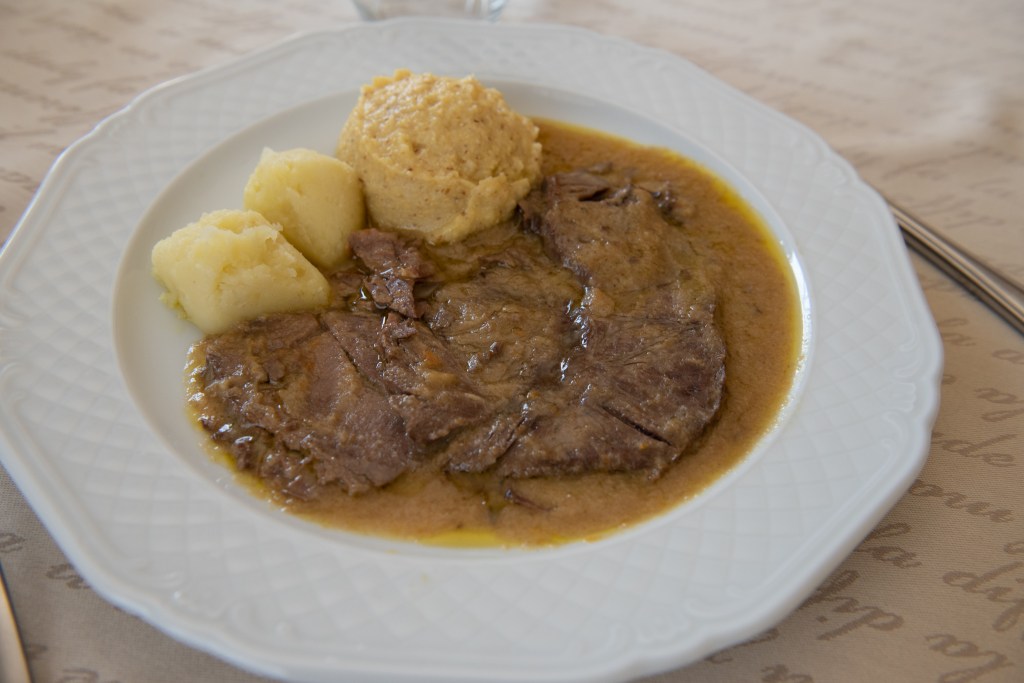 La carne deve cuocere a fuoco moderato per due ore abbondanti, quindi la si taglia a fette e le si fa riprendere la cottura per almeno un’ora. Delicatamente le fette vengono poi accomodate in un piatto ovale profondo e lasciate riposare coperte con il loro sugo.