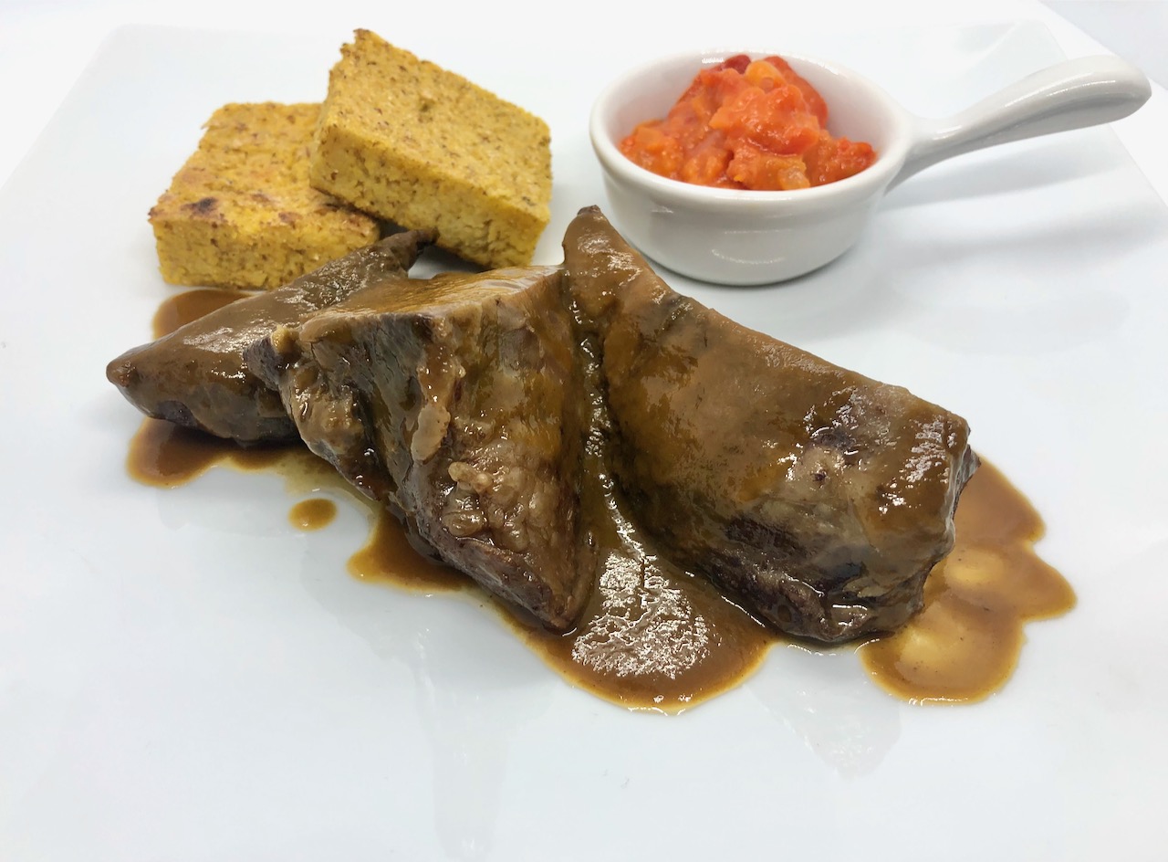 Quando la carne si sarà raffreddato tagliatela a fette di circa 1 cm e adagiatela in una padella. Aggiungete la salsa di cottura e un mestolo di acqua. Portare a cottura il Manzo all’Olio. Una volta che la carne sarà ben calda e la salsa omogenea servire con polenta.