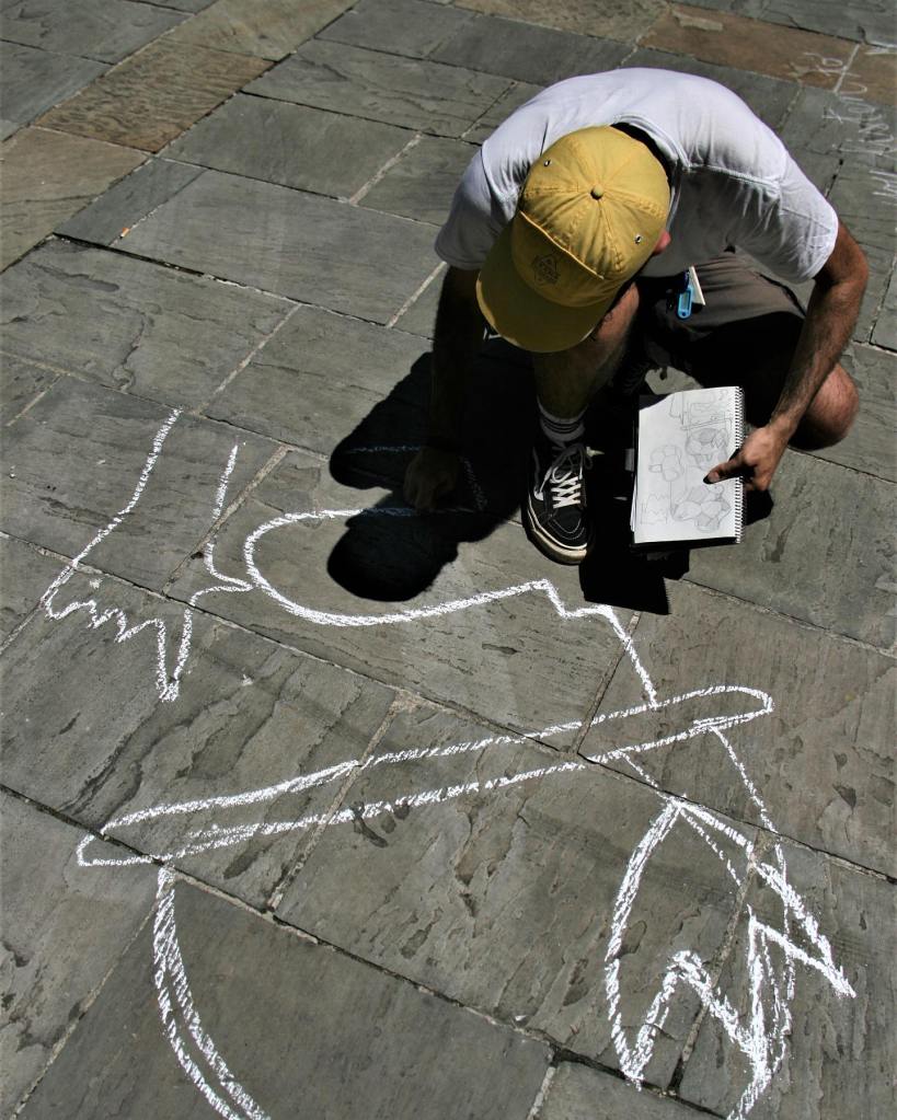 Ci spostiamo un momento dalla tavola, dalle tavole, per capire con lui più chiaramente il senso di questa pacifica invasione dei marciapiedi: «I marciapiedi sono spazi urbani riservati alle persone, perché possano spostarsi, di fatto viverli, in piena sicurezza, non è ammissibile, la loro invasione da parte di veicoli che hanno la strada come luogo di loro pertinenza, non si deve alterare il loro senso, la loro funzione. Ecco che da luogo di transito dedicato qui diventano luogo di creatività». Il marciapiede è inoltre esposto all’azione del tempo, anche di quello meteorologico e pare affiorare un altro collegamento: il cibo, il piatto, magari sapientemente presentato, decorato, è opera effimera, destinata a sparire con il consumo del suo contenuto – consumo che è di fatto la funzione dello stesso – così come il fumetto disegnato su questa striscia di asfalto, la sua fine, la sua cancellazione è già segnata dal tempo cronologico e dalla prima pioggia che cadrà.