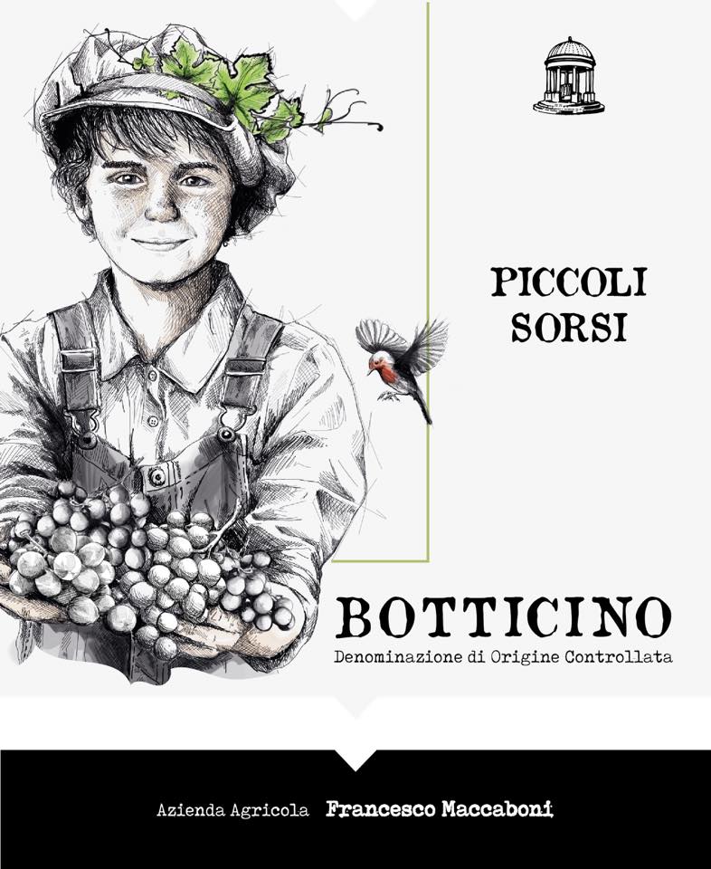 A integrare il lavoro in vigna e in cantina sono pronte le etichette disegnate da Giulia Maccaboni, che ha lasciato in larga parte la sua formazione accademica ma non si è certo dimenticata di un tratto felice che ancora utilizza per altri impieghi: un tocco in più verso il futuro.