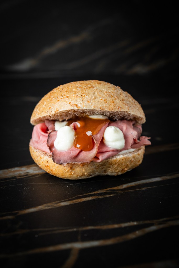 Mini burger al vapore, carne salada (Az. Agricola Bettella), fichi e una salsa al Parmigiano. Il pane, pasta di riporto, è prima cotto al vapore poi terminato in forno, sotto la finissima crosta praticamente si scioglie: nell’insieme vale già il venire qui per provarlo.