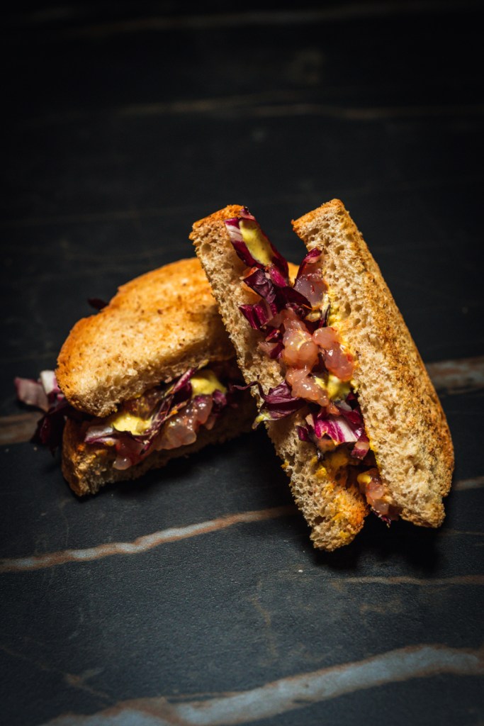 Pan toast, scampo, radicchio e curry. Qui lo scampo, sia pure delicato, si sente eccome: l’insieme è delizioso, ad abbassare un poco la piacevolezza complessiva è stranamente il pane, che non riesce a convincermi del tutto. Rimediabile.