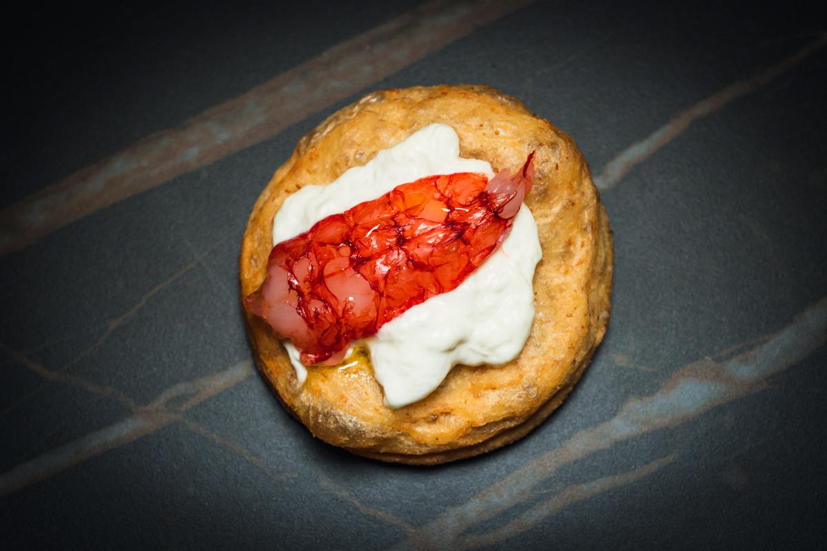 Pizzina fritta, stracciatella, gambero rosso di Mazara. Buono, buono anche se del gambero si apprezza più la consistenza, quel suo apportare una nota «cruda» all’insieme che non il gusto, un poco sommerso dalle altre presenze.