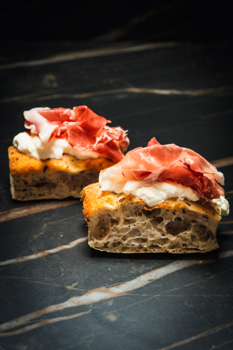 Arriva il menu ed è il secondo, felice, passo. Carta Aperitivi, cinque Metodi Classici, dallo Champagne al Lambrusco passando per l’ottimo Franciacorta DOCG Dosaggio Zero Vintage Collection 2016 di Cà del Bosco e dal valido Franciacorta DOCG Extra Brut S.A. dei Camossi, due vini fermi, tra cui quello che per me è il Lugana DOC: Marangona 2020, giovane giovane ma si farà. Poi un paio di Drink (non Drinks, i plurali inglesi in un testo italiano vanno declinati al singolare) tra cui un lussuosissimo Spritz Inedito (Bitter Opera Rossa, Franciacorta Camossi Extra Brut, Vermouth Bianco di Arudi, Seltz) a cui non guasterebbe una minore presenza di ghiaccio, un paio di Analcolici e altrettanti, di livello, Gin Tonic, miscela ormai proposta a tutte le ore. Un piccolo stuzzichino, per noi del pane di segale tostato con del pomodoro, ed ecco la lista degli Starter.