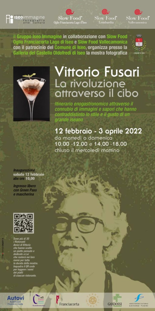 Si inaugura questo sabato, 12 febbraio, negli spazi del Castello Oldofredi di Iseo, Vittorio Fusari: la rivoluzione attraverso il cibo, mostra fotografica dedicata alla figura scomparsa a gennaio del 2020, aperta sino al 3 aprile e partita da un’idea del Gruppo IseoImmagine – Arte e cultura fotografica. Progetto cresciuto sino a coinvolgere la sua famiglia con Anna Patrizia Ucci, il Comune di Iseo, Slow Food Lombardia, le condotte Oglio Franciacorta Lago d’Iseo e quella Vallecamonica… Più tanti ristoranti che proporranno per tutta la durata della stessa un piatto a lui dedicato, alla sua idea di cucina, all’attenzione unica per i prodotti del territorio bresciano.
