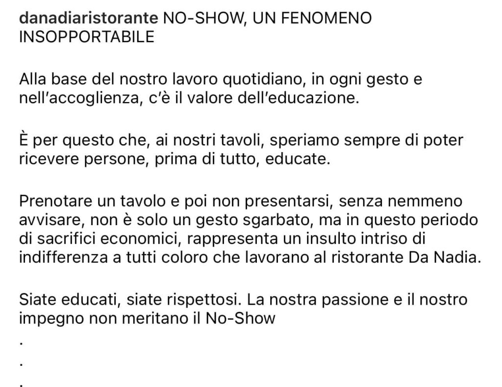 In cambio di un gesto minimo eviterete a chi sta lavorando in quel momento, mentre voi vi aggregate all’ultimo istante a un’altra compagnia o semplicemente scoprite di desiderare pesce anziché carne, o ancora avete scoperto che l’ancora esistente TripAdvisor sconsiglia, no non lui che ha le mani perennemente lavate e igienizzate, vivamente la vostra preventiva scelta «Mi aspettavo di più, porzioni piccole e prezzi alti, scelta di piatti scarsa…», perda concretamente lavoro, incasso, nonché, specie per alcune tipologie di locali, veda pregiudicati gli acquisti di derrate per quell’occasione.